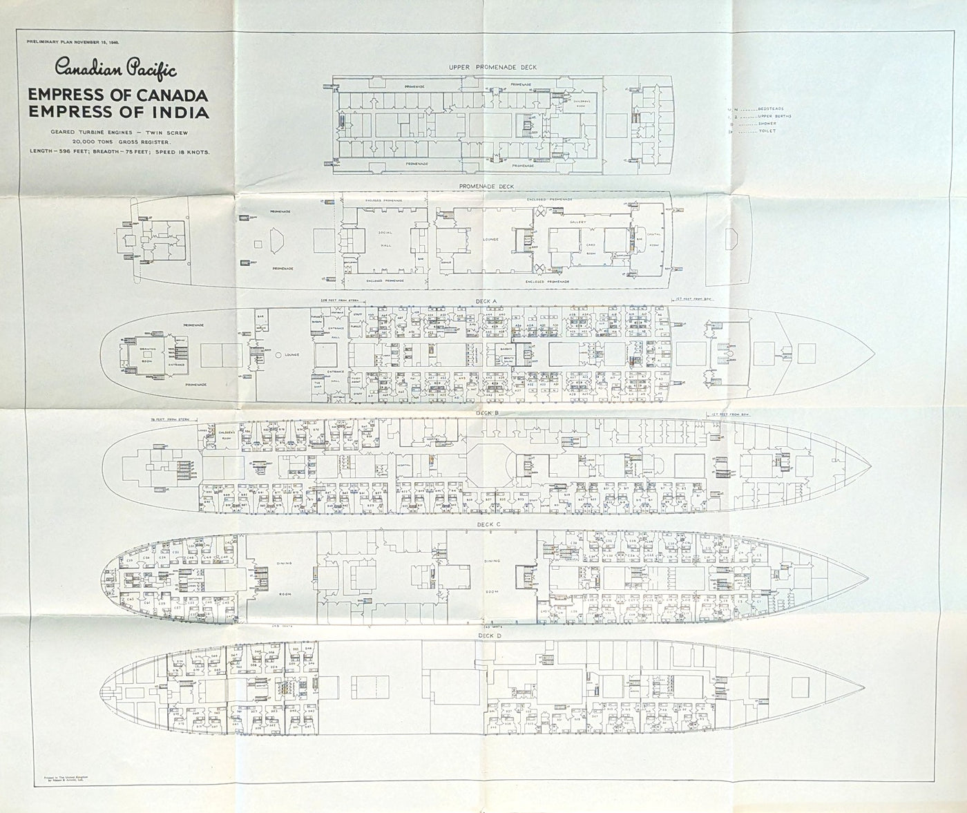 {"id":10160276767001,"title":"EMPRESS OF INDIA \u0026 EMPRESS OF CANADA - Rare 1946 plan before name change, fire","handle":"empress-of-india-empress-of-canada-rare-1946-plan-before-name-change-fire","description":"\u003cp\u003eCanadian Pacific - A rare deck dated November 16, 1946, for the sister ships EMPRESS OF INDIA and EMPRESS OF CANADA. Before the war they sailed as DUCHESS OF BEDFORD and DUCHESS OF RICHMOND.\u003c\/p\u003e\n\u003cp\u003eThe plan was issued while the ships were undergoing restoration after arduous war duty. But before the work was finished, India declared independence from Britain. So the name EMPRESS OF INDIA was out, replaced with EMPRESS OF FRANCE, making this plan exceptionally rare.\u003c\/p\u003e\n\u003cp\u003eThe plan measures 25\" by 30. Six decks are shown in detailed. Although class divisions are not marked, both First and Tourist classes are shown. \u003c\/p\u003e\n\u003cp\u003eAfter the name change, EMPRESS OF FRANCE went on to sail successfully for Canadian Pacific until her date with the breakers in 1960. However, the EMPRESS OF CANADA met a tragic end when she caught fire and capsized in her berth at Gladstone Dock, Liverpool in January 1953. It took more than a year to get the hulk righted and towed away.\u003c\/p\u003e\n\u003cp\u003eVery good condition.\u003c\/p\u003e","published_at":"2025-10-12T15:36:25-04:00","created_at":"2025-10-12T15:36:23-04:00","vendor":"FR","type":"- Deck Plans","tags":["- Deck Plans","A to Z: 100s of Ships","Canadian Pacific"],"price":15000,"price_min":15000,"price_max":15000,"available":true,"price_varies":false,"compare_at_price":null,"compare_at_price_min":0,"compare_at_price_max":0,"compare_at_price_varies":false,"variants":[{"id":51518307664153,"title":"Default Title","option1":"Default Title","option2":null,"option3":null,"sku":"12469","requires_shipping":true,"taxable":true,"featured_image":null,"available":true,"name":"EMPRESS OF INDIA \u0026 EMPRESS OF CANADA - Rare 1946 plan before name change, fire","public_title":null,"options":["Default Title"],"price":15000,"weight":170,"compare_at_price":null,"inventory_quantity":1,"inventory_management":"shopify","inventory_policy":"deny","barcode":"","requires_selling_plan":false,"selling_plan_allocations":[]}],"images":["\/\/nautiques.net\/cdn\/shop\/files\/12469.jpg?v=1760297727","\/\/nautiques.net\/cdn\/shop\/files\/12469-1.jpg?v=1760297727","\/\/nautiques.net\/cdn\/shop\/files\/12469-2.jpg?v=1760297727","\/\/nautiques.net\/cdn\/shop\/files\/12469-3.jpg?v=1760297727","\/\/nautiques.net\/cdn\/shop\/files\/12469-4.jpg?v=1760297727","\/\/nautiques.net\/cdn\/shop\/files\/12469-5.jpg?v=1760297727"],"featured_image":"\/\/nautiques.net\/cdn\/shop\/files\/12469.jpg?v=1760297727","options":["Title"],"media":[{"alt":null,"id":42042471743769,"position":1,"preview_image":{"aspect_ratio":1.315,"height":1186,"width":1560,"src":"\/\/nautiques.net\/cdn\/shop\/files\/12469.jpg?v=1760297727"},"aspect_ratio":1.315,"height":1186,"media_type":"image","src":"\/\/nautiques.net\/cdn\/shop\/files\/12469.jpg?v=1760297727","width":1560},{"alt":null,"id":42042471776537,"position":2,"preview_image":{"aspect_ratio":1.189,"height":1330,"width":1582,"src":"\/\/nautiques.net\/cdn\/shop\/files\/12469-1.jpg?v=1760297727"},"aspect_ratio":1.189,"height":1330,"media_type":"image","src":"\/\/nautiques.net\/cdn\/shop\/files\/12469-1.jpg?v=1760297727","width":1582},{"alt":null,"id":42042471809305,"position":3,"preview_image":{"aspect_ratio":2.289,"height":982,"width":2248,"src":"\/\/nautiques.net\/cdn\/shop\/files\/12469-2.jpg?v=1760297727"},"aspect_ratio":2.289,"height":982,"media_type":"image","src":"\/\/nautiques.net\/cdn\/shop\/files\/12469-2.jpg?v=1760297727","width":2248},{"alt":null,"id":42042471842073,"position":4,"preview_image":{"aspect_ratio":2.309,"height":1164,"width":2688,"src":"\/\/nautiques.net\/cdn\/shop\/files\/12469-3.jpg?v=1760297727"},"aspect_ratio":2.309,"height":1164,"media_type":"image","src":"\/\/nautiques.net\/cdn\/shop\/files\/12469-3.jpg?v=1760297727","width":2688},{"alt":null,"id":42042471874841,"position":5,"preview_image":{"aspect_ratio":0.944,"height":1430,"width":1350,"src":"\/\/nautiques.net\/cdn\/shop\/files\/12469-4.jpg?v=1760297727"},"aspect_ratio":0.944,"height":1430,"media_type":"image","src":"\/\/nautiques.net\/cdn\/shop\/files\/12469-4.jpg?v=1760297727","width":1350},{"alt":null,"id":42042471907609,"position":6,"preview_image":{"aspect_ratio":1.444,"height":1485,"width":2145,"src":"\/\/nautiques.net\/cdn\/shop\/files\/12469-5.jpg?v=1760297727"},"aspect_ratio":1.444,"height":1485,"media_type":"image","src":"\/\/nautiques.net\/cdn\/shop\/files\/12469-5.jpg?v=1760297727","width":2145}],"requires_selling_plan":false,"selling_plan_groups":[],"content":"\u003cp\u003eCanadian Pacific - A rare deck dated November 16, 1946, for the sister ships EMPRESS OF INDIA and EMPRESS OF CANADA. Before the war they sailed as DUCHESS OF BEDFORD and DUCHESS OF RICHMOND.\u003c\/p\u003e\n\u003cp\u003eThe plan was issued while the ships were undergoing restoration after arduous war duty. But before the work was finished, India declared independence from Britain. So the name EMPRESS OF INDIA was out, replaced with EMPRESS OF FRANCE, making this plan exceptionally rare.\u003c\/p\u003e\n\u003cp\u003eThe plan measures 25\" by 30. Six decks are shown in detailed. Although class divisions are not marked, both First and Tourist classes are shown. \u003c\/p\u003e\n\u003cp\u003eAfter the name change, EMPRESS OF FRANCE went on to sail successfully for Canadian Pacific until her date with the breakers in 1960. However, the EMPRESS OF CANADA met a tragic end when she caught fire and capsized in her berth at Gladstone Dock, Liverpool in January 1953. It took more than a year to get the hulk righted and towed away.\u003c\/p\u003e\n\u003cp\u003eVery good condition.\u003c\/p\u003e"}