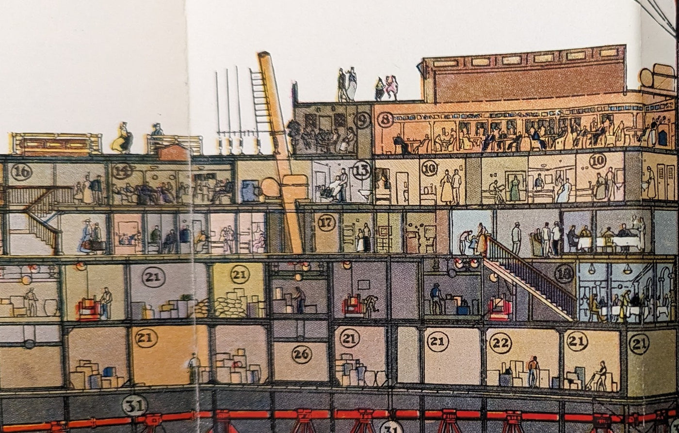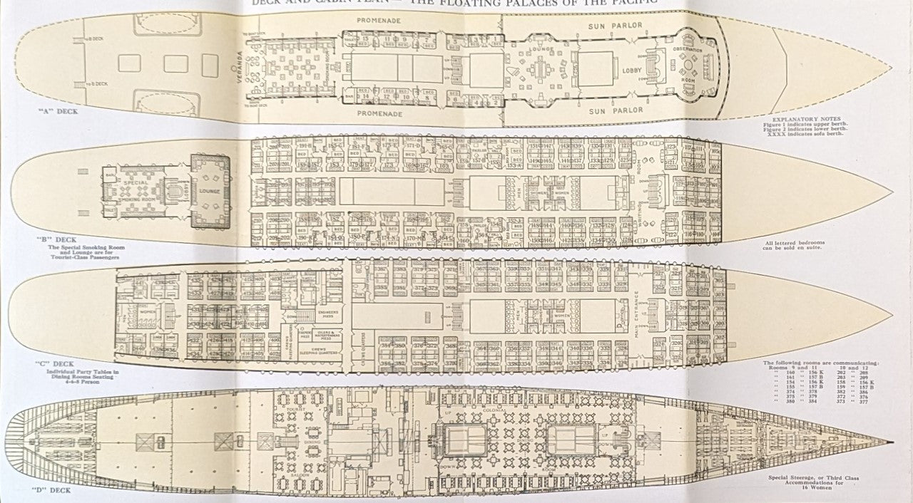 {"id":10113704755481,"title":"GREAT NORTHERN: 1915 - Hawaii brochure w\/ amazing 32\" color cutaway","handle":"great-northern-1915-hawaii-brochure-w-amazing-32-color-cutaway","description":"\u003cp\u003eGreat Northern Pacific Steamship Company: An innocuous looking brochure from 1915 that packs a big punch. Buried deep inside is a gorgeous fold-out cutaway of the GREAT NORTHERN. \u003cbr\u003e \u003cbr\u003eThis line only lasted from 1915 to 1917. The main route was Los Angeles to Portland, Oregon. But during the winter of 1915-1916 the GREAT NORTHERN was switched to Hawaii service which is when this brochure was issued. The ship and her sister NORTHERN PACIFIC were then drafted for military duty in 1917 and the service was discontinued. \u003cbr\u003e \u003cbr\u003eThe sixteen-page brochure promotes the GREAT NORTHERN as \"The Floating Palace of the Pacific\". Photos show the First Class Observation Parlor, Music Room, Writing Room, Smoking Room, Colonial Dining Room, a cabin en suite, a two-berth stateroom, and Palm Garden Verandah. Tourist Class images include the Lounge, \"Smoker\", Dining Saloon, and a cabin. Plans show four decks. A color map show the Great Northern Railroad's track across the U.S. and the steamship routes to Hawaii and Portland, Oregon. \u003cbr\u003e \u003cbr\u003eBut it is the cutaway that is the blockbuster. You should have seen my jaw drop when I unexpectedly unfolded this 32\" beauty. Forty-five areas, from the Wheel House to the Triple Screw Propellers, are marked off. And much to my continued delight, the unknown artist populated the ship with tiny figures. Elegantly dressed couples in Edwardian garb fill the First Class public rooms. Many decks down engineers are bending over the machinery. The galley is crowded with chefs in white coats and waiters carrying trays. Fully clothed women are washing over sinks in the Shower Baths while next door naked men are taking showers. \u003cbr\u003e \u003cbr\u003eThe Navy took over the two ships for transport in the fall of 1917 and managed to wreck the NORTHERN PACIFIC in 1919. After the war, the GREAT NORTHERN went on to the Los Angeles Steamship Company to become their famed \"Galloping Ghost\", the H.F. ALEXANDER. \u003cbr\u003e \u003cbr\u003eThe brochure is in fair condition with tape repairs and loose pages while, amazingly, the cutaway is in excellent condition and suitable for framing.\u003c\/p\u003e","published_at":"2025-09-28T17:36:23-04:00","created_at":"2025-09-28T17:36:20-04:00","vendor":"N","type":"- Brochures and Paper","tags":["- Artwork","- Brochures and Paper","- Deck Plans","A to Z: 100s of Ships","Great Northern Pacific Steamship Co."],"price":15000,"price_min":15000,"price_max":15000,"available":true,"price_varies":false,"compare_at_price":null,"compare_at_price_min":0,"compare_at_price_max":0,"compare_at_price_varies":false,"variants":[{"id":51429803655449,"title":"Default Title","option1":"Default Title","option2":null,"option3":null,"sku":"10715a","requires_shipping":true,"taxable":false,"featured_image":null,"available":true,"name":"GREAT NORTHERN: 1915 - Hawaii brochure w\/ amazing 32\" color cutaway","public_title":null,"options":["Default Title"],"price":15000,"weight":170,"compare_at_price":null,"inventory_quantity":1,"inventory_management":"shopify","inventory_policy":"deny","barcode":"","requires_selling_plan":false,"selling_plan_allocations":[]}],"images":["\/\/nautiques.net\/cdn\/shop\/files\/10715a.jpg?v=1759095287","\/\/nautiques.net\/cdn\/shop\/files\/10715a-5.jpg?v=1759262331","\/\/nautiques.net\/cdn\/shop\/files\/10715a-1.jpg?v=1759262331","\/\/nautiques.net\/cdn\/shop\/files\/10715a-2.jpg?v=1759262331","\/\/nautiques.net\/cdn\/shop\/files\/10715a-3.jpg?v=1759262331","\/\/nautiques.net\/cdn\/shop\/files\/10715a-4.jpg?v=1759262331","\/\/nautiques.net\/cdn\/shop\/files\/10715a-6.jpg?v=1759095288","\/\/nautiques.net\/cdn\/shop\/files\/10715a-7.jpg?v=1759095288","\/\/nautiques.net\/cdn\/shop\/files\/10715a-8.jpg?v=1759095288","\/\/nautiques.net\/cdn\/shop\/files\/10715a-9.jpg?v=1759095287","\/\/nautiques.net\/cdn\/shop\/files\/10715a-10.jpg?v=1759095288","\/\/nautiques.net\/cdn\/shop\/files\/10715a-11.jpg?v=1759095288"],"featured_image":"\/\/nautiques.net\/cdn\/shop\/files\/10715a.jpg?v=1759095287","options":["Title"],"media":[{"alt":null,"id":41941810413849,"position":1,"preview_image":{"aspect_ratio":0.899,"height":2188,"width":1966,"src":"\/\/nautiques.net\/cdn\/shop\/files\/10715a.jpg?v=1759095287"},"aspect_ratio":0.899,"height":2188,"media_type":"image","src":"\/\/nautiques.net\/cdn\/shop\/files\/10715a.jpg?v=1759095287","width":1966},{"alt":null,"id":41941810577689,"position":2,"preview_image":{"aspect_ratio":3.536,"height":661,"width":2337,"src":"\/\/nautiques.net\/cdn\/shop\/files\/10715a-5.jpg?v=1759262331"},"aspect_ratio":3.536,"height":661,"media_type":"image","src":"\/\/nautiques.net\/cdn\/shop\/files\/10715a-5.jpg?v=1759262331","width":2337},{"alt":null,"id":41941810446617,"position":3,"preview_image":{"aspect_ratio":0.899,"height":2188,"width":1966,"src":"\/\/nautiques.net\/cdn\/shop\/files\/10715a-1.jpg?v=1759262331"},"aspect_ratio":0.899,"height":2188,"media_type":"image","src":"\/\/nautiques.net\/cdn\/shop\/files\/10715a-1.jpg?v=1759262331","width":1966},{"alt":null,"id":41941810479385,"position":4,"preview_image":{"aspect_ratio":1.774,"height":2188,"width":3881,"src":"\/\/nautiques.net\/cdn\/shop\/files\/10715a-2.jpg?v=1759262331"},"aspect_ratio":1.774,"height":2188,"media_type":"image","src":"\/\/nautiques.net\/cdn\/shop\/files\/10715a-2.jpg?v=1759262331","width":3881},{"alt":null,"id":41941810512153,"position":5,"preview_image":{"aspect_ratio":1.774,"height":2188,"width":3881,"src":"\/\/nautiques.net\/cdn\/shop\/files\/10715a-3.jpg?v=1759262331"},"aspect_ratio":1.774,"height":2188,"media_type":"image","src":"\/\/nautiques.net\/cdn\/shop\/files\/10715a-3.jpg?v=1759262331","width":3881},{"alt":null,"id":41941810544921,"position":6,"preview_image":{"aspect_ratio":1.774