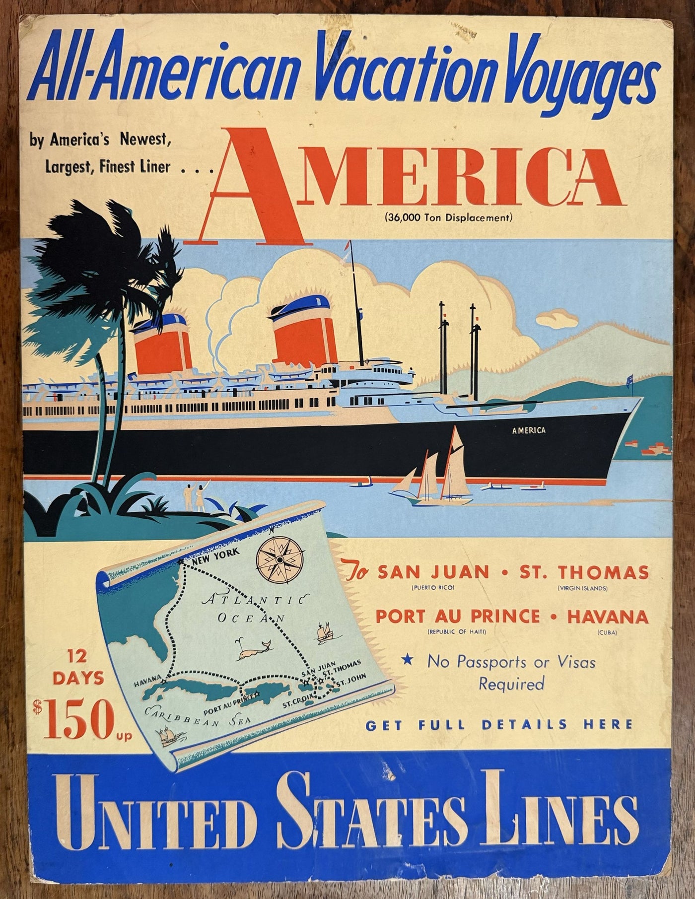 {"id":10245858918681,"title":"AMERICA: 1940 - Original c. 1940 travel agency standee","handle":"america-1940-original-c-1940-travel-agency-standee","description":"\u003cp\u003eUnited States Lines - A colorful travel agency standee for the S.S. AMERICA.\u003c\/p\u003e\n\u003cp\u003eThe standee was distributed to travel agencies around the time of the AMERICA's 1940 maiden voyage, when crossing the Atlantic was no longer safe and Yankee ships stayed close to home. It measures 10\"5\" by 14\" and is made of cardboard. The original fold-out leg is still attached on back.\u003c\/p\u003e\n\u003cp\u003eGood condition with light discoloration and water staining on back.\u003c\/p\u003e","published_at":"2026-01-20T14:31:42-05:00","created_at":"2026-01-20T14:31:41-05:00","vendor":"FOB","type":"- Artwork","tags":["- Artwork","holding","United States Lines"],"price":12500,"price_min":12500,"price_max":12500,"available":false,"price_varies":false,"compare_at_price":null,"compare_at_price_min":0,"compare_at_price_max":0,"compare_at_price_varies":false,"variants":[{"id":51881039724825,"title":"Default Title","option1":"Default Title","option2":null,"option3":null,"sku":"10030","requires_shipping":true,"taxable":true,"featured_image":null,"available":false,"name":"AMERICA: 1940 - Original c. 1940 travel agency standee","public_title":null,"options":["Default Title"],"price":12500,"weight":454,"compare_at_price":null,"inventory_quantity":0,"inventory_management":"shopify","inventory_policy":"deny","barcode":"","requires_selling_plan":false,"selling_plan_allocations":[]}],"images":["\/\/nautiques.net\/cdn\/shop\/files\/10030.jpg?v=1768937424","\/\/nautiques.net\/cdn\/shop\/files\/10030-1.jpg?v=1768937424"],"featured_image":"\/\/nautiques.net\/cdn\/shop\/files\/10030.jpg?v=1768937424","options":["Title"],"media":[{"alt":null,"id":42773502230809,"position":1,"preview_image":{"aspect_ratio":0.773,"height":2500,"width":1933,"src":"\/\/nautiques.net\/cdn\/shop\/files\/10030.jpg?v=1768937424"},"aspect_ratio":0.773,"height":2500,"media_type":"image","src":"\/\/nautiques.net\/cdn\/shop\/files\/10030.jpg?v=1768937424","width":1933},{"alt":null,"id":42773502263577,"position":2,"preview_image":{"aspect_ratio":0.766,"height":2500,"width":1914,"src":"\/\/nautiques.net\/cdn\/shop\/files\/10030-1.jpg?v=1768937424"},"aspect_ratio":0.766,"height":2500,"media_type":"image","src":"\/\/nautiques.net\/cdn\/shop\/files\/10030-1.jpg?v=1768937424","width":1914}],"requires_selling_plan":false,"selling_plan_groups":[],"content":"\u003cp\u003eUnited States Lines - A colorful travel agency standee for the S.S. AMERICA.\u003c\/p\u003e\n\u003cp\u003eThe standee was distributed to travel agencies around the time of the AMERICA's 1940 maiden voyage, when crossing the Atlantic was no longer safe and Yankee ships stayed close to home. It measures 10\"5\" by 14\" and is made of cardboard. The original fold-out leg is still attached on back.\u003c\/p\u003e\n\u003cp\u003eGood condition with light discoloration and water staining on back.\u003c\/p\u003e"}
