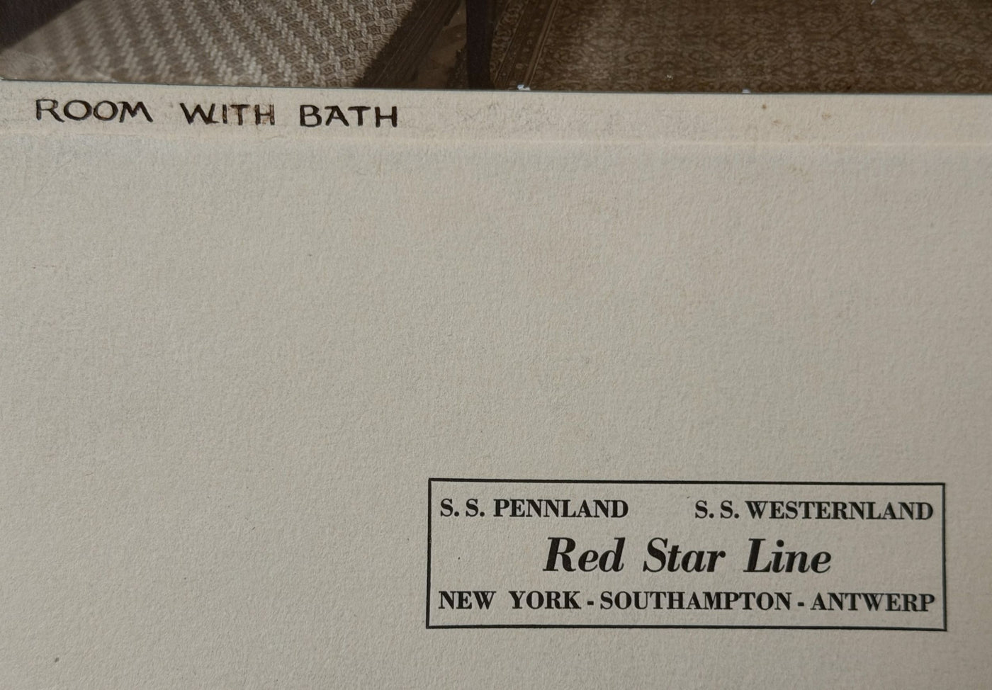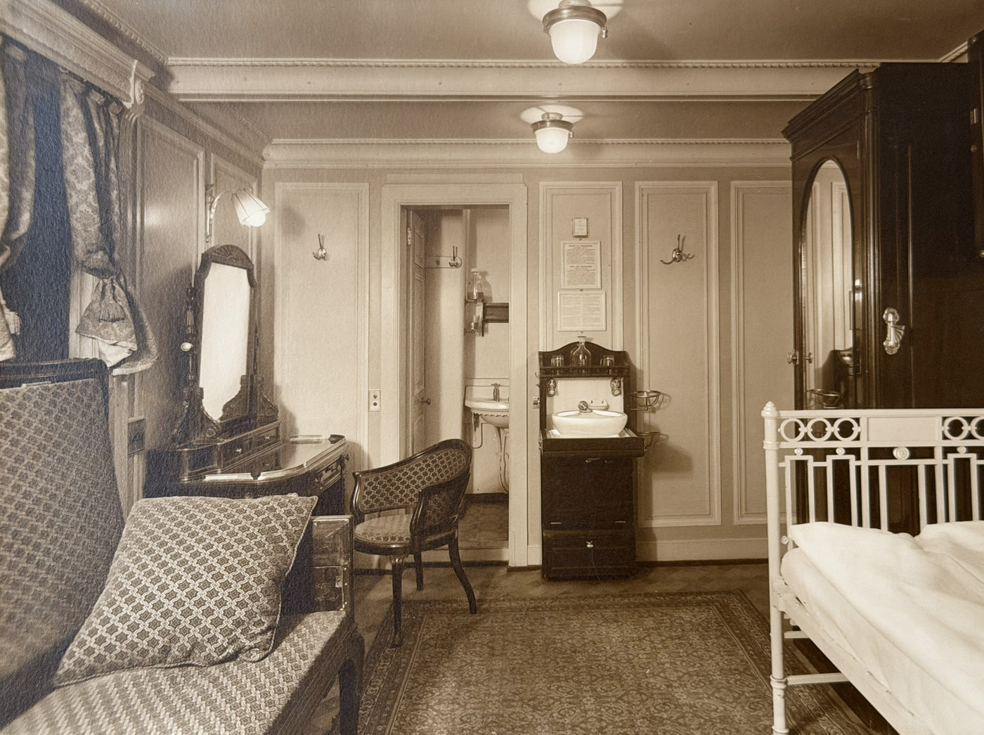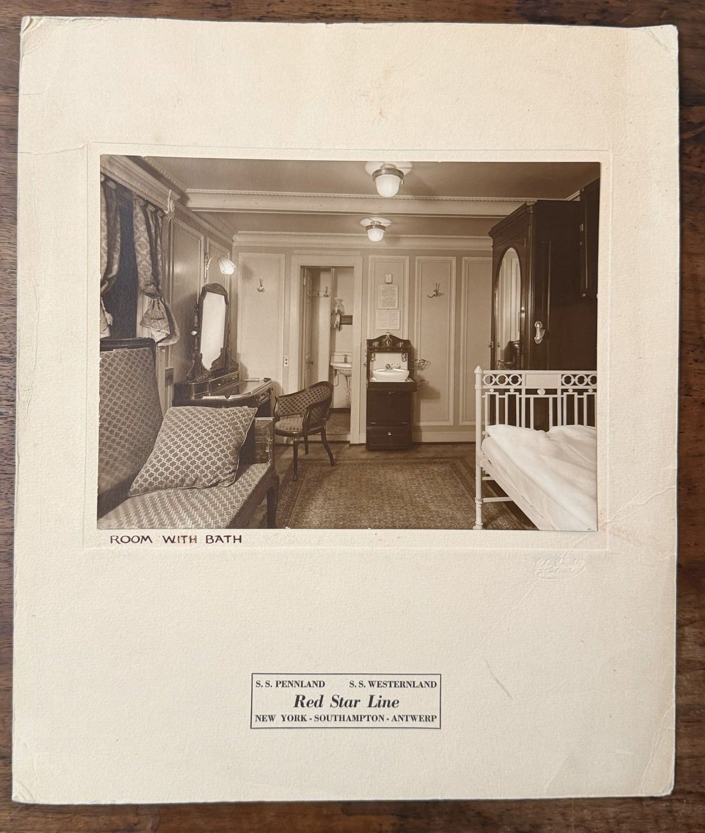 {"id":10245064687897,"title":"KROONLAND \u0026 PENNLAND - Agency display card w\/ cabin photograph","handle":"kroonland-pennland-agency-display-card-w-cabin-photograph","description":"\u003cp\u003eRed Star Line - An agency display card from the mid-1920s for the KROONLAND (1902) and PENNLAND (1922) with a photo of a \"room with bath\".\u003c\/p\u003e\n\u003cp\u003eThe card is printed on textured stock and measures 12\" by 14\". A real 7\" by 9.5\" photograph is attached. Printed underneath are the line and ship names along with the ports serviced. \u003c\/p\u003e\n\u003cp\u003eThe comfy-looking cabin is probably from the later PENNLAND but looks a generation older. Among its delights are an iron bedstead, brocade-covered settee, large mahogany armoire, desk with mirror, and, despite the fact that the cabin came with a private bath, a folding wash-basin cabinet. How the steward must have cussed when faced with emptying the waste water when there was a bathroom sink just beyond the door!\u003c\/p\u003e\n\u003cp\u003eGood condition with light wear around the edges. \u003c\/p\u003e","published_at":"2026-01-19T16:52:51-05:00","created_at":"2026-01-19T16:52:50-05:00","vendor":"N","type":"- Artwork","tags":["- Artwork","- Brochures and Paper","A to Z: 100s of Ships","holding","Red Star Line"],"price":3500,"price_min":3500,"price_max":3500,"available":true,"price_varies":false,"compare_at_price":null,"compare_at_price_min":0,"compare_at_price_max":0,"compare_at_price_varies":false,"variants":[{"id":51878576423193,"title":"Default Title","option1":"Default Title","option2":null,"option3":null,"sku":"3557a","requires_shipping":true,"taxable":true,"featured_image":null,"available":true,"name":"KROONLAND \u0026 PENNLAND - Agency display card w\/ cabin photograph","public_title":null,"options":["Default Title"],"price":3500,"weight":340,"compare_at_price":null,"inventory_quantity":1,"inventory_management":"shopify","inventory_policy":"deny","barcode":"","requires_selling_plan":false,"selling_plan_allocations":[]}],"images":["\/\/nautiques.net\/cdn\/shop\/files\/3557a.jpg?v=1768859476","\/\/nautiques.net\/cdn\/shop\/files\/3557a-1.jpg?v=1768859476","\/\/nautiques.net\/cdn\/shop\/files\/3557a-2.jpg?v=1768859476"],"featured_image":"\/\/nautiques.net\/cdn\/shop\/files\/3557a.jpg?v=1768859476","options":["Title"],"media":[{"alt":null,"id":42767329132825,"position":1,"preview_image":{"aspect_ratio":0.848,"height":2500,"width":2119,"src":"\/\/nautiques.net\/cdn\/shop\/files\/3557a.jpg?v=1768859476"},"aspect_ratio":0.848,"height":2500,"media_type":"image","src":"\/\/nautiques.net\/cdn\/shop\/files\/3557a.jpg?v=1768859476","width":2119},{"alt":null,"id":42767329165593,"position":2,"preview_image":{"aspect_ratio":1.339,"height":2852,"width":3820,"src":"\/\/nautiques.net\/cdn\/shop\/files\/3557a-1.jpg?v=1768859476"},"aspect_ratio":1.339,"height":2852,"media_type":"image","src":"\/\/nautiques.net\/cdn\/shop\/files\/3557a-1.jpg?v=1768859476","width":3820},{"alt":null,"id":42767329198361,"position":3,"preview_image":{"aspect_ratio":1.438,"height":1739,"width":2500,"src":"\/\/nautiques.net\/cdn\/shop\/files\/3557a-2.jpg?v=1768859476"},"aspect_ratio":1.438,"height":1739,"media_type":"image","src":"\/\/nautiques.net\/cdn\/shop\/files\/3557a-2.jpg?v=1768859476","width":2500}],"requires_selling_plan":false,"selling_plan_groups":[],"content":"\u003cp\u003eRed Star Line - An agency display card from the mid-1920s for the KROONLAND (1902) and PENNLAND (1922) with a photo of a \"room with bath\".\u003c\/p\u003e\n\u003cp\u003eThe card is printed on textured stock and measures 12\" by 14\". A real 7\" by 9.5\" photograph is attached. Printed underneath are the line and ship names along with the ports serviced. \u003c\/p\u003e\n\u003cp\u003eThe comfy-looking cabin is probably from the later PENNLAND but looks a generation older. Among its delights are an iron bedstead, brocade-covered settee, large mahogany armoire, desk with mirror, and, despite the fact that the cabin came with a private bath, a folding wash-basin cabinet. How the steward must have cussed when faced with emptying the waste water when there was a bathroom sink just beyond the door!\u003c\/p\u003e\n\u003cp\u003eGood condition with light wear around the edges. \u003c\/p\u003e"}