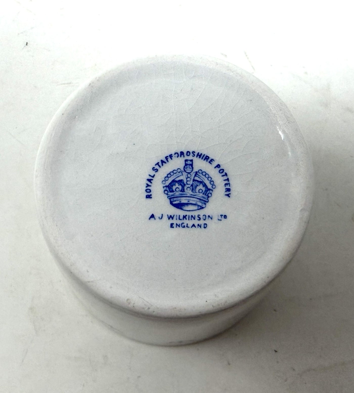 Included are a 5.75" tall coffee pot with lid, 3.5" diameter coffee cup with 4.5" saucer, 5.25 side bowl, 3.5" lemon slice dish, and a 3" tall sugar packet dish (or perhaps a mustard pot minus the cover). The coffee pot is bottom-marked Tuscan China, the sugar packet dish Royal Staffordshire, and the remaining pieces Ridgway Steelite.
