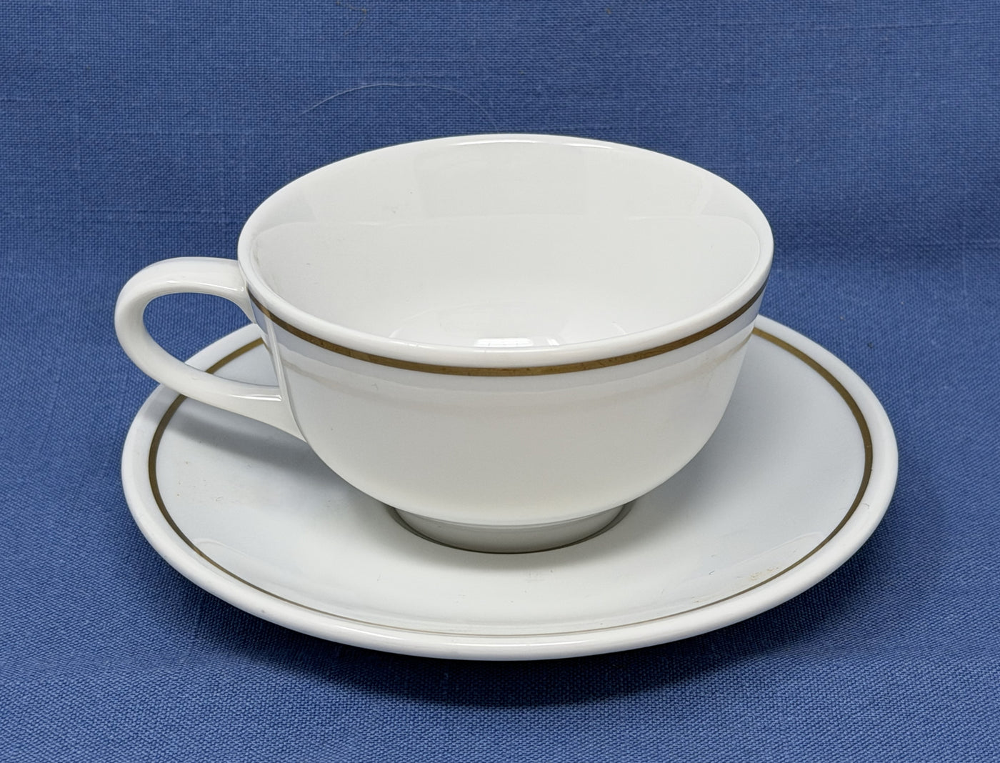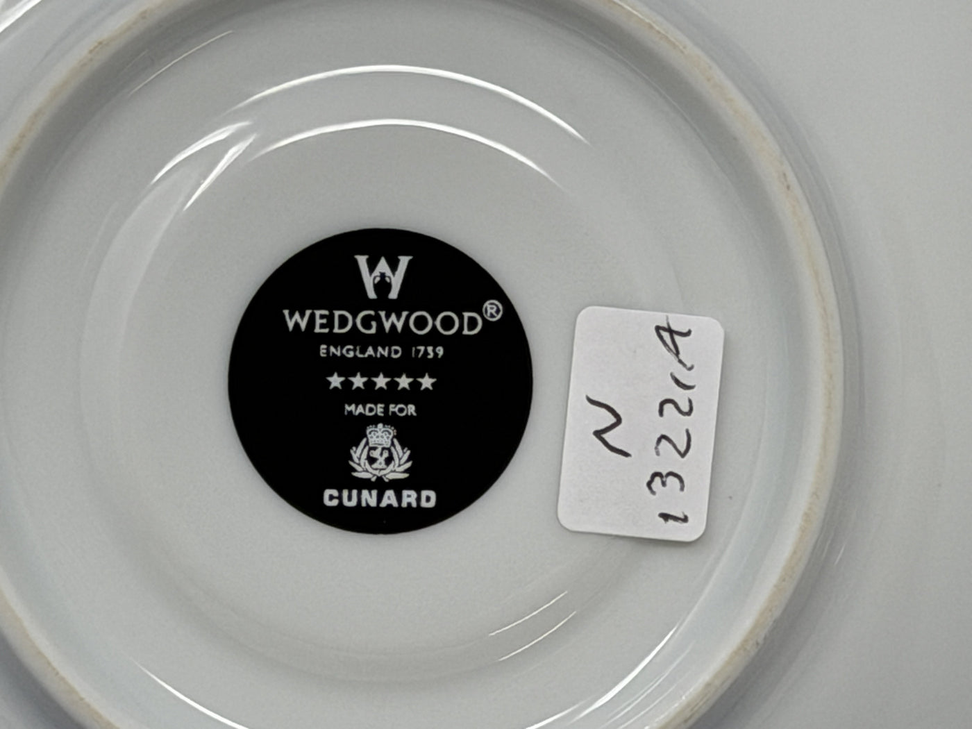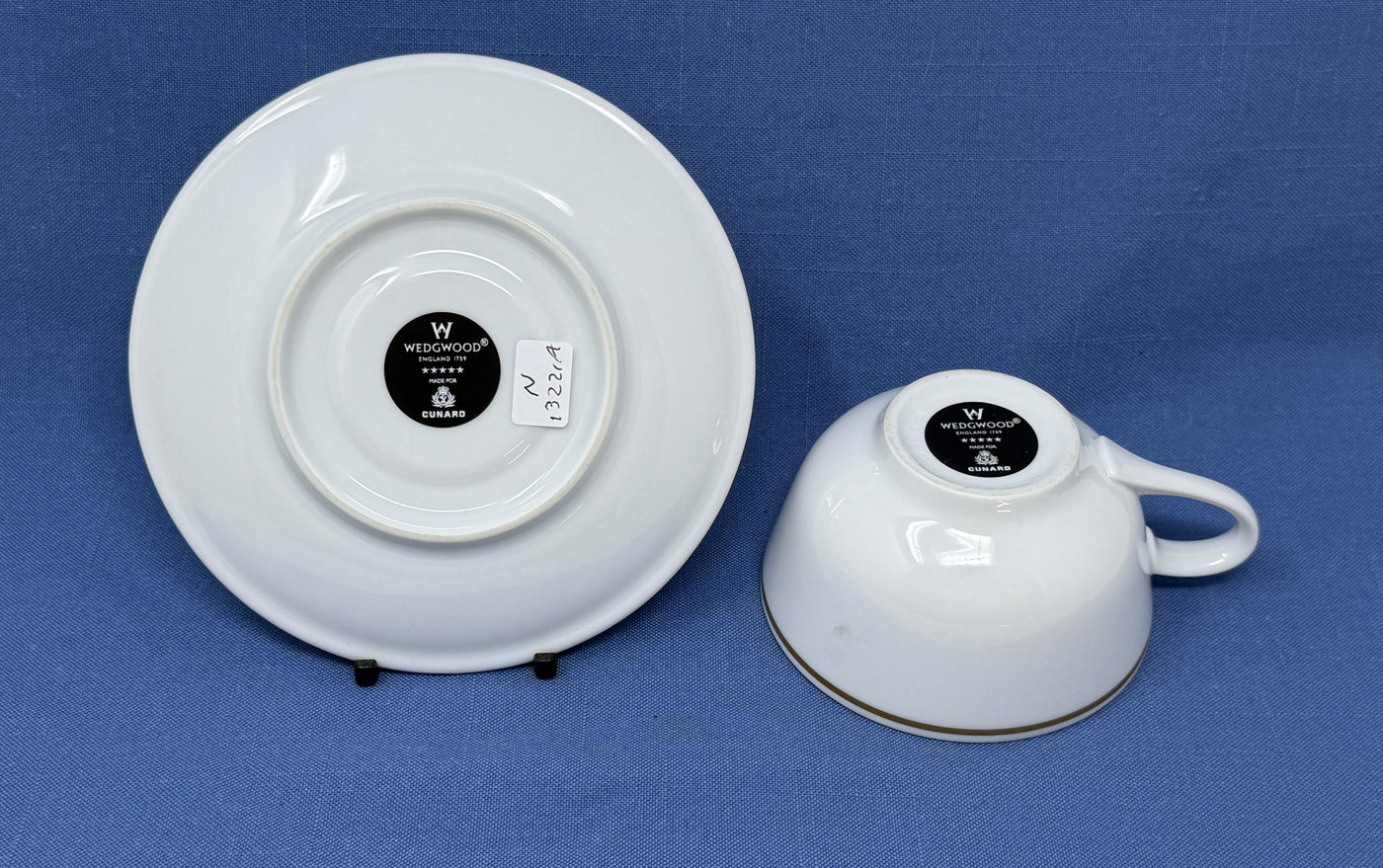 Both the 3.75" diameter cup and 5.5" diameter saucer are bottom marked Wedgwood along with Cunard. Notice - no top logo. After 165 years Cunard finally wised up that passengers loved to swipe marked china. Memorabilia dealers of the future will take a hit in their income.