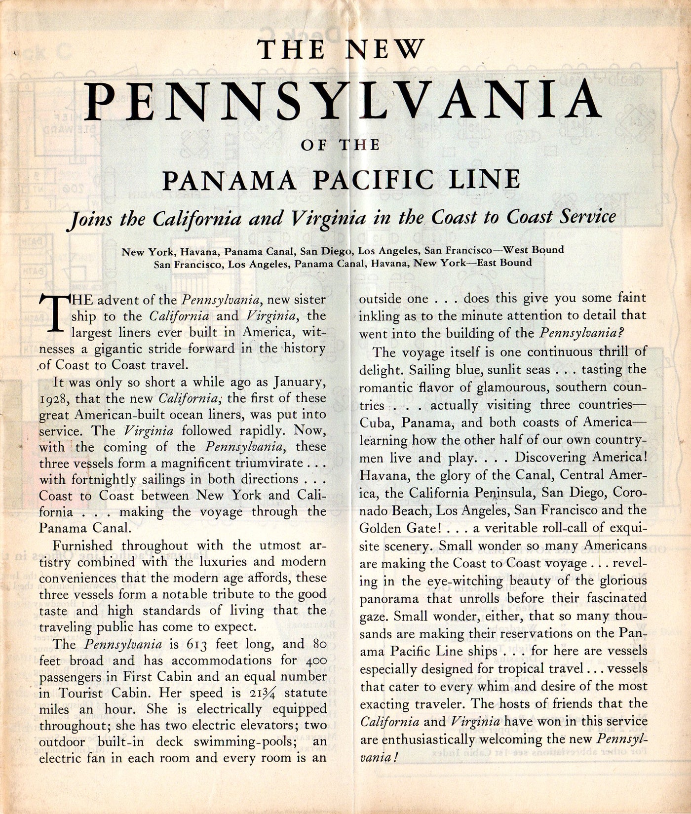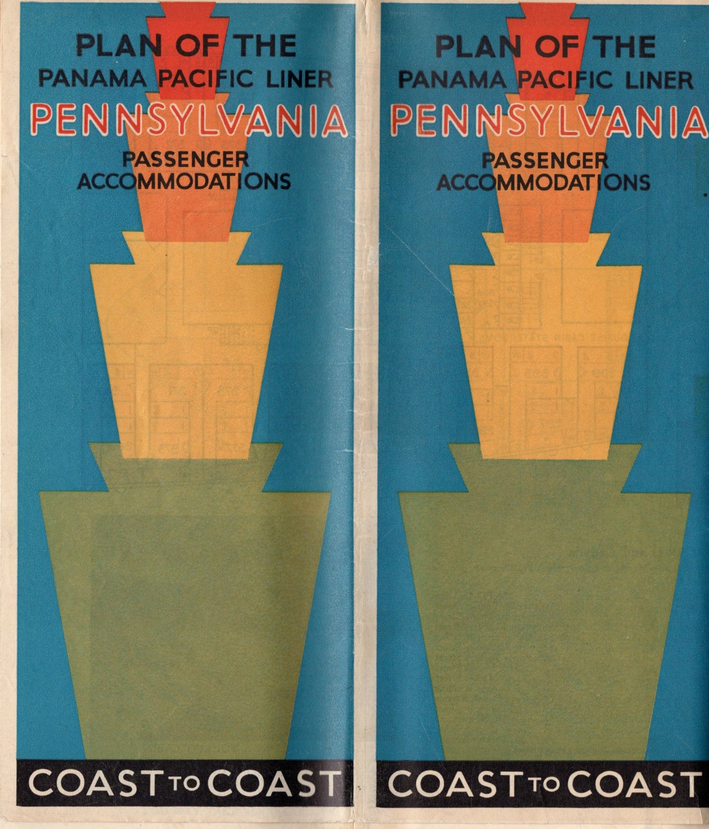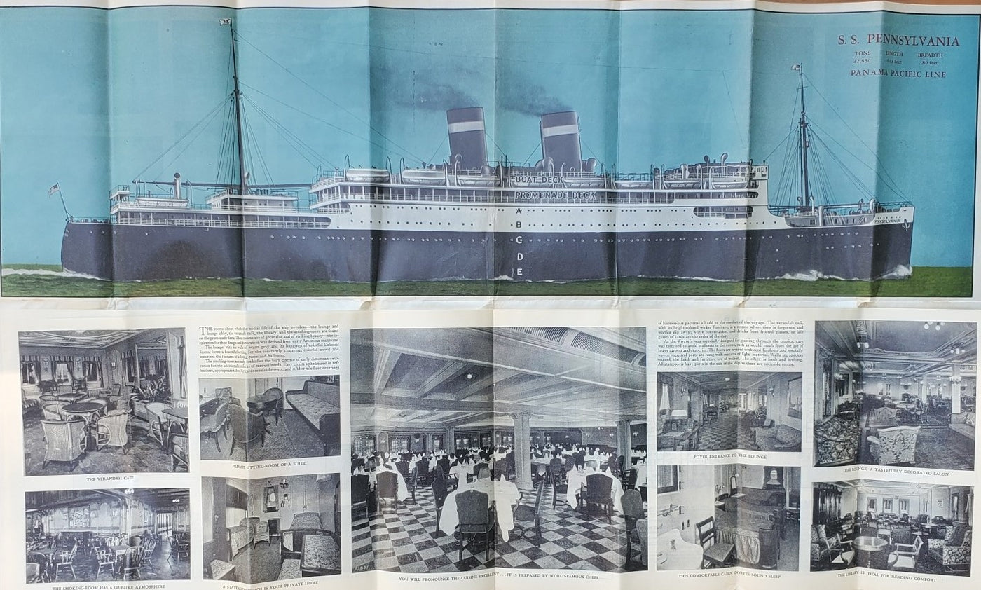 Panama Pacific Line:  A deluxe deck plan  for the PENNSYLVANIA dated August 1929, several months before her December maiden voyage.