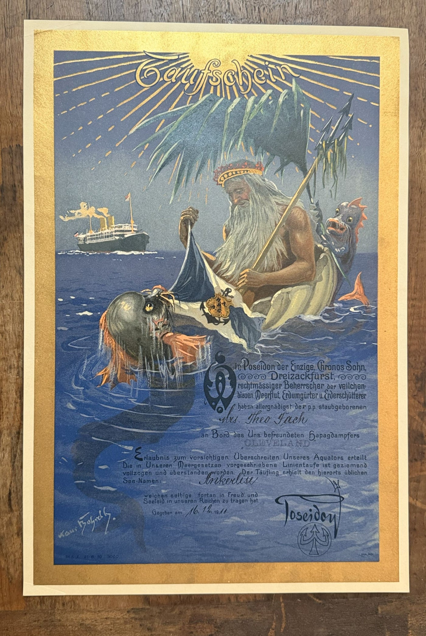 {"id":10244823843097,"title":"CLEVELAND: 1909 - Special folder w\/ ATW souvenirs from 1911-1912","handle":"cleveland-1909-special-folder-w-atw-souvenirs-from-1911-1912","description":"\u003cp\u003eHamburg American Line - An impressive 13\" by 17\" specialty folder filled with souvenirs from the CLEVELAND's 1911-12 Around-the-World Cruise on the S.S. CLEVELAND.\u003c\/p\u003e\n\u003cp\u003eTheodore and Bertha Fach of St. Louis joined a fraternal organization tour. In those pre-Panama Canal days, HAPAG would begin tours in New York and end them in San Francisco four months later. Two 7\" by 9.5\" group photos show the men and women lined up on deck with a life ring in front and an American flag behind. \u003c\/p\u003e\n\u003cp\u003eA gorgeous 11\" by 16\" color crossing-the-equator certificate made out to Mrs. Fach features imaginative artwork by famed German maritime artist Hans Bohrdt (1857-1945) with text in German. The ship crossed on December 16, 1911. \u003c\/p\u003e\n\u003cp\u003eMrs. Fach also scooped up another crossing certificate, also dated 12\/16\/11 but this time in English. The graphics are in b\u0026amp;w but a portrait of the CLEVELAND is included. I'd don't see an artist's signature but the style points to Bohrdt. The certificate measures 12.5\" by 16\".\u003c\/p\u003e\n\u003cp\u003eThe last certificate, also 12.5\" by 16\", certifies that Mrs. Fach is a member of \"The Girdlers\", as in \"girdling the globe\". A montage of exotic sights surrounds a portrait of the ship along with Poseidon surfing on a dolphin.\u003c\/p\u003e\n\u003cp\u003eAlso included - a 37\" long CLEVELAND hat ribbon, a bill from Cairo's Grand Continental Hotel, and newspaper clippings announcing the couple's arrival in various European cities.\u003c\/p\u003e\n\u003cp\u003eExcellent condition.\u003c\/p\u003e","published_at":"2026-01-19T11:24:24-05:00","created_at":"2026-01-19T11:24:23-05:00","vendor":"N","type":"- Brochures and Paper","tags":["- Brochures and Paper","- Souvenirs","Hamburg American Line","holding"],"price":9500,"price_min":9500,"price_max":9500,"available":false,"price_varies":false,"compare_at_price":null,"compare_at_price_min":0,"compare_at_price_max":0,"compare_at_price_varies":false,"variants":[{"id":51877491310873,"title":"Default Title","option1":"Default Title","option2":null,"option3":null,"sku":"2481c","requires_shipping":true,"taxable":true,"featured_image":null,"available":false,"name":"CLEVELAND: 1909 - Special folder w\/ ATW souvenirs from 1911-1912","public_title":null,"options":["Default Title"],"price":9500,"weight":907,"compare_at_price":null,"inventory_quantity":0,"inventory_management":"shopify","inventory_policy":"deny","barcode":"","requires_selling_plan":false,"selling_plan_allocations":[]}],"images":["\/\/nautiques.net\/cdn\/shop\/files\/2481c.jpg?v=1768840064","\/\/nautiques.net\/cdn\/shop\/files\/2481c-15.jpg?v=1768840176","\/\/nautiques.net\/cdn\/shop\/files\/2481c-1.jpg?v=1768840176","\/\/nautiques.net\/cdn\/shop\/files\/2481c-2.jpg?v=1768840176","\/\/nautiques.net\/cdn\/shop\/files\/2481c-3.jpg?v=1768840176","\/\/nautiques.net\/cdn\/shop\/files\/2481c-4.jpg?v=1768840176","\/\/nautiques.net\/cdn\/shop\/files\/2481c-5.jpg?v=1768840176","\/\/nautiques.net\/cdn\/shop\/files\/2481c-6.jpg?v=1768840176","\/\/nautiques.net\/cdn\/shop\/files\/2481c-7.jpg?v=1768840176","\/\/nautiques.net\/cdn\/shop\/files\/2481c-8.jpg?v=1768840176","\/\/nautiques.net\/cdn\/shop\/files\/2481c-9.jpg?v=1768840176","\/\/nautiques.net\/cdn\/shop\/files\/2481c-10.jpg?v=1768840176","\/\/nautiques.net\/cdn\/shop\/files\/2481c-11.jpg?v=1768840176","\/\/nautiques.net\/cdn\/shop\/files\/2481c-12.jpg?v=1768840176","\/\/nautiques.net\/cdn\/shop\/files\/2481c-13.jpg?v=1768840176","\/\/nautiques.net\/cdn\/shop\/files\/2481c-14.jpg?v=1768840176"],"featured_image":"\/\/nautiques.net\/cdn\/shop\/files\/2481c.jpg?v=1768840064","options":["Title"],"media":[{"alt":null,"id":42765745914137,"position":1,"preview_image":{"aspect_ratio":1.551,"height":1612,"width":2500,"src":"\/\/nautiques.net\/cdn\/shop\/files\/2481c.jpg?v=1768840064"},"aspect_ratio":1.551,"height":1612,"media_type":"image","src":"\/\/nautiques.net\/cdn\/shop\/files\/2481c.jpg?v=1768840064","width":2500},{"alt":null,"id":42765764624665,"position":2,"preview_image":{"aspect_ratio":0.651,"height":2500,"width":1628,"src":"\/\/nautiques.net\/cdn\/shop\/files\/2481c-15.jpg?v=1768840176"},"aspect_ratio":0.651,"height":2500,"media_type":"image","src":"\/\/nautiques.net\/cdn\/shop\/files\/2481c-15.jpg?v=1768840176","width":1628},{"alt":null,"id":42765748863257,"position":3,"preview_image":{"aspect_ratio":0.67,"height":2500,"width":1676,"src":"\/\/nautiques.net\/cdn\/shop\/files\/2481c-1.jpg?v=1768840176"},"aspect_ratio":0.67,"height":2500,"media_type":"image","src":"\/\/nautiques.net\/cdn\/shop\/files\/2481c-1.jpg?v=1768840176","width":1676},{"alt":null,"id":42765748896025,"position":4,"preview_image":{"aspect_ratio":1.044,"height":2395,"width":2500,"src":"\/\/nautiques.net\/cdn\/shop\/files\/2481c-2.jpg?v=1768840176"},"aspect_ratio":1.044,"height":2395,"media_type":"image","src":"\/\/nautiques.net\/cdn\/shop\/files\/2481c-2.jpg?v=1768840176","width":2500},{"alt":null,"id":42765748928793,"position":5,"preview_image":{"aspect_ratio":1.266,"height":1974,"width":2500,"src":"\/\/nautiques.net\/cdn\/shop\/files\/2481c-3.jpg?v=1768840176"},"aspect_ratio":1.266,"height":1974,"media_type":"image","src":"\/\/nautiques.net\/cdn\/shop\/files\/2481c-3.jpg?v=1768840176","width":2500},{"alt":null,"id":42765750370585,"position":6,"preview_image":{"aspect_ratio":0.771,"height":2500,"width":1927,"src":"\/\/nautiques.net\/cdn\/shop\/files\/2481c-4.jpg?v=1768840176"},"aspect_ratio":0.771,"height":2500,"media_type":"image","src":"\/\/nautiques.net\/cdn\/shop\/files\/2481c-4.jpg?v=1768840176","width":1927},{"alt":null,"id":42765750403353,"position":7,"preview_image":{"aspect_ratio":1.438,"height":1738,"width":2500,"src":"\/\/nautiques.net\/cdn\/shop\/files\/2481c-5.jpg?
