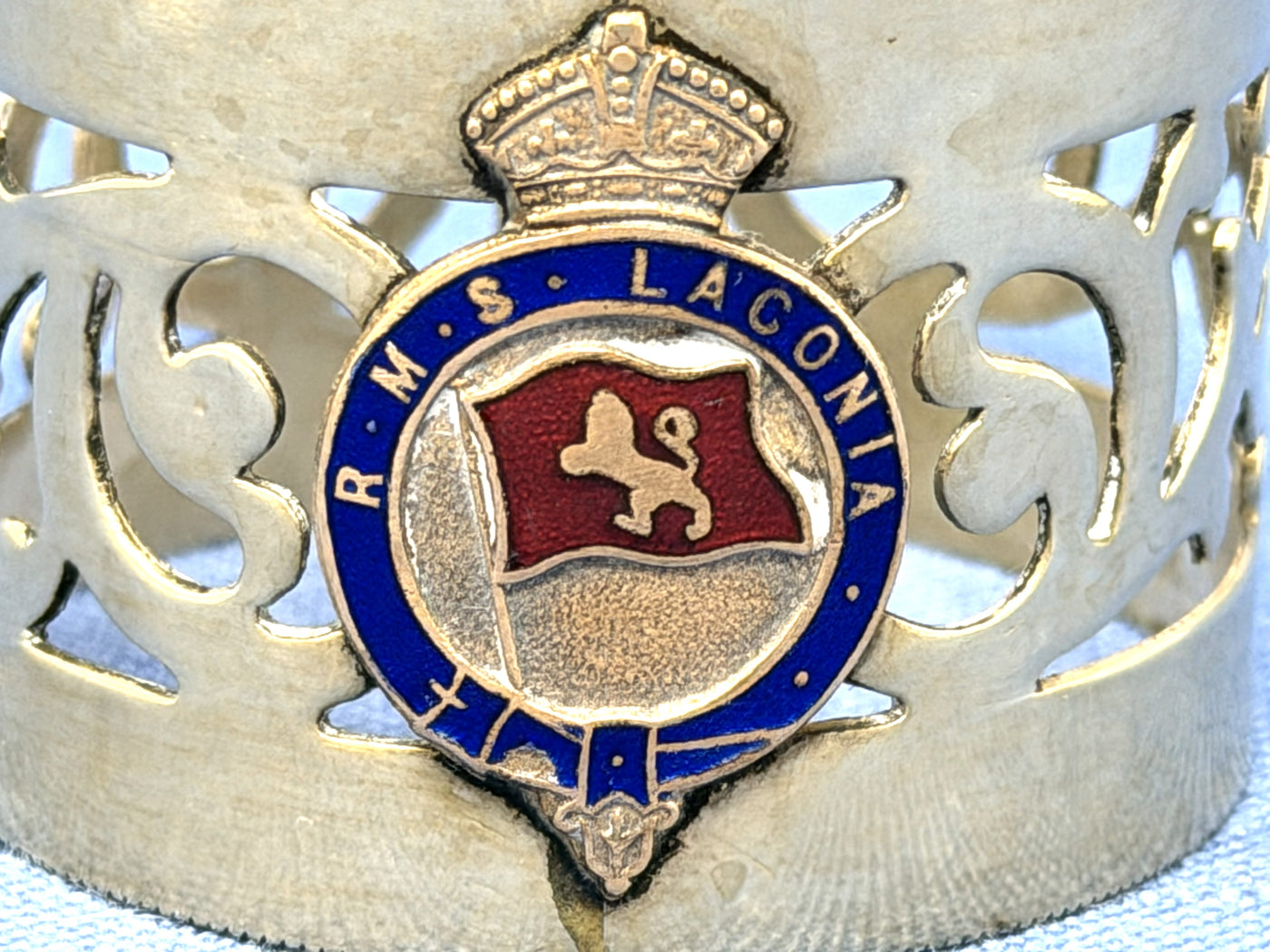 The silverplated napkin ring was sold onboard the ill-fated liner during the 1920s or early 1930s.  The LACONIA was sunk during WW2 in dramatic circumstances.