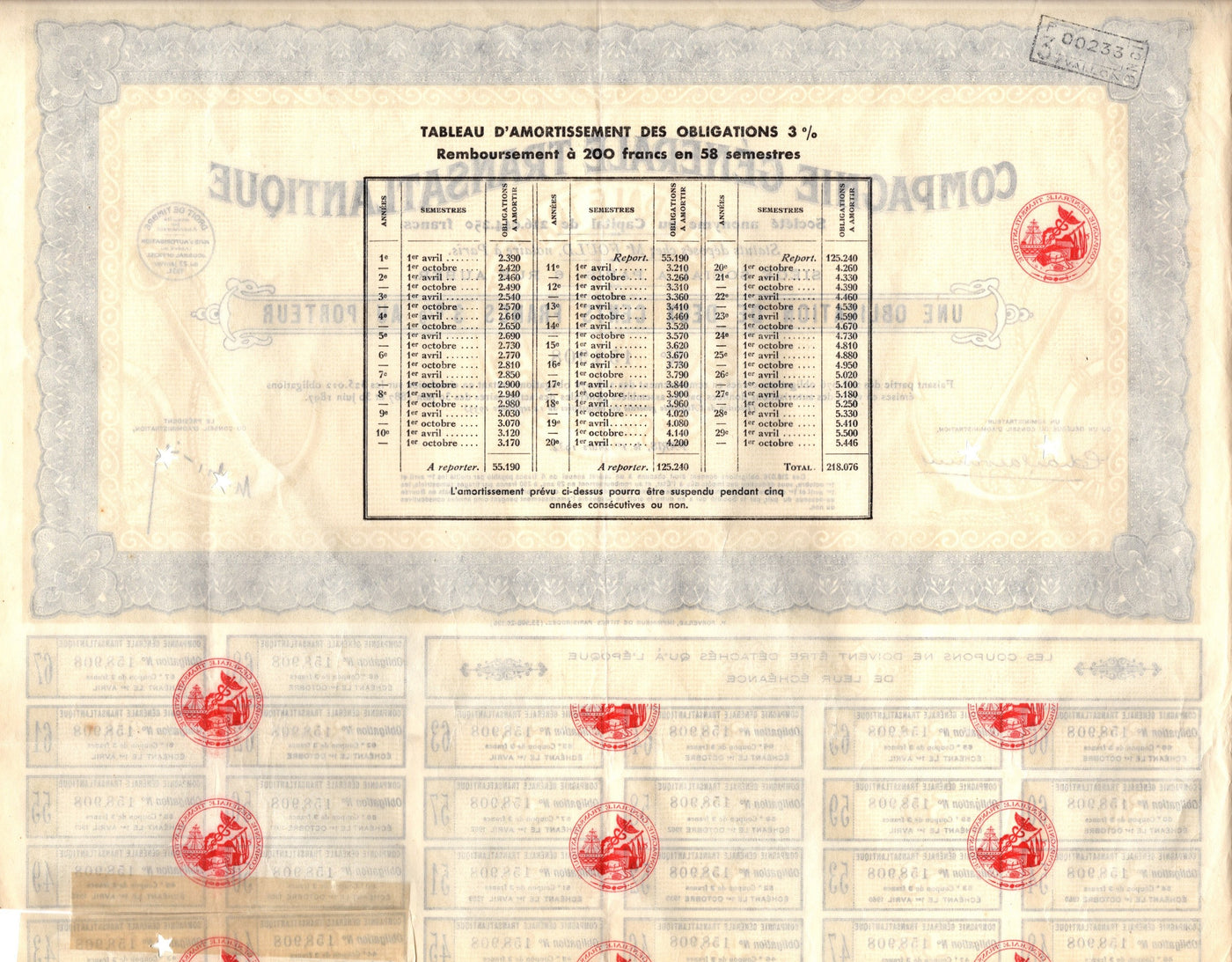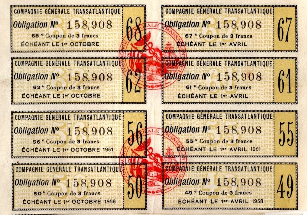 {"id":10234062766361,"title":"Various: pre-war - 1934 Compagnie Generale Transatlantique bond certificate","handle":"various-pre-war-1934-compagnie-generale-transatlantique-bond-certificate","description":"\u003cp\u003eFrench Line - A bond certificate for 200 francs dated March 1, 1934, from Compagnie Generale Transatlantique. \u003c\/p\u003e\n\u003cp\u003eThe 12.5\" by 15\" certificate is printed on crisp stock and features twin anchors and an old-style CGT logo in the background. Below are thirty-six remaining coupons which were turned in every six months to redeem three francs. The coupons run through 1962 but apparently the bond was cashed out in 1955.\u003c\/p\u003e\n\u003cp\u003eI wonder if the bearer purchased the bond in 1934 in anticipation of the upcoming NORMANDIE and cashed out in 1955 when French Line's post-war fleet was finally in place?\u003c\/p\u003e\n\u003cp\u003eVery good condition.\u003c\/p\u003e","published_at":"2026-01-05T12:06:58-05:00","created_at":"2026-01-05T12:06:57-05:00","vendor":"N","type":"- Brochures and Paper","tags":["- Brochures and Paper","French Line","holding"],"price":9500,"price_min":9500,"price_max":9500,"available":true,"price_varies":false,"compare_at_price":null,"compare_at_price_min":0,"compare_at_price_max":0,"compare_at_price_varies":false,"variants":[{"id":51830387867929,"title":"Default Title","option1":"Default Title","option2":null,"option3":null,"sku":"4679a","requires_shipping":true,"taxable":true,"featured_image":null,"available":true,"name":"Various: pre-war - 1934 Compagnie Generale Transatlantique bond certificate","public_title":null,"options":["Default Title"],"price":9500,"weight":142,"compare_at_price":null,"inventory_quantity":1,"inventory_management":"shopify","inventory_policy":"deny","barcode":"","requires_selling_plan":false,"selling_plan_allocations":[]}],"images":["\/\/nautiques.net\/cdn\/shop\/files\/4679a.jpg?v=1767632760","\/\/nautiques.net\/cdn\/shop\/files\/4679a-1.jpg?v=1767632760","\/\/nautiques.net\/cdn\/shop\/files\/4679a-2.jpg?v=1767632760","\/\/nautiques.net\/cdn\/shop\/files\/4679a-3.jpg?v=1767632760","\/\/nautiques.net\/cdn\/shop\/files\/4679a-4.jpg?v=1767632760","\/\/nautiques.net\/cdn\/shop\/files\/4679a-5.jpg?v=1767632760"],"featured_image":"\/\/nautiques.net\/cdn\/shop\/files\/4679a.jpg?v=1767632760","options":["Title"],"media":[{"alt":null,"id":42646209298713,"position":1,"preview_image":{"aspect_ratio":1.378,"height":2200,"width":3032,"src":"\/\/nautiques.net\/cdn\/shop\/files\/4679a.jpg?v=1767632760"},"aspect_ratio":1.378,"height":2200,"media_type":"image","src":"\/\/nautiques.net\/cdn\/shop\/files\/4679a.jpg?v=1767632760","width":3032},{"alt":null,"id":42646209331481,"position":2,"preview_image":{"aspect_ratio":1.0,"height":736,"width":736,"src":"\/\/nautiques.net\/cdn\/shop\/files\/4679a-1.jpg?v=1767632760"},"aspect_ratio":1.0,"height":736,"media_type":"image","src":"\/\/nautiques.net\/cdn\/shop\/files\/4679a-1.jpg?v=1767632760","width":736},{"alt":null,"id":42646209364249,"position":3,"preview_image":{"aspect_ratio":0.737,"height":963,"width":710,"src":"\/\/nautiques.net\/cdn\/shop\/files\/4679a-2.jpg?v=1767632760"},"aspect_ratio":0.737,"height":963,"media_type":"image","src":"\/\/nautiques.net\/cdn\/shop\/files\/4679a-2.jpg?v=1767632760","width":710},{"alt":null,"id":42646209397017,"position":4,"preview_image":{"aspect_ratio":1.424,"height":695,"width":990,"src":"\/\/nautiques.net\/cdn\/shop\/files\/4679a-3.jpg?v=1767632760"},"aspect_ratio":1.424,"height":695,"media_type":"image","src":"\/\/nautiques.net\/cdn\/shop\/files\/4679a-3.jpg?v=1767632760","width":990},{"alt":null,"id":42646209429785,"position":5,"preview_image":{"aspect_ratio":1.281,"height":2340,"width":2997,"src":"\/\/nautiques.net\/cdn\/shop\/files\/4679a-4.jpg?v=1767632760"},"aspect_ratio":1.281,"height":2340,"media_type":"image","src":"\/\/nautiques.net\/cdn\/shop\/files\/4679a-4.jpg?v=1767632760","width":2997},{"alt":null,"id":42646209462553,"position":6,"preview_image":{"aspect_ratio":1.241,"height":1056,"width":1311,"src":"\/\/nautiques.net\/cdn\/shop\/files\/4679a-5.jpg?v=1767632760"},"aspect_ratio":1.241,"height":1056,"media_type":"image","src":"\/\/nautiques.net\/cdn\/shop\/files\/4679a-5.jpg?v=1767632760","width":1311}],"requires_selling_plan":false,"selling_plan_groups":[],"content":"\u003cp\u003eFrench Line - A bond certificate for 200 francs dated March 1, 1934, from Compagnie Generale Transatlantique. \u003c\/p\u003e\n\u003cp\u003eThe 12.5\" by 15\" certificate is printed on crisp stock and features twin anchors and an old-style CGT logo in the background. Below are thirty-six remaining coupons which were turned in every six months to redeem three francs. The coupons run through 1962 but apparently the bond was cashed out in 1955.\u003c\/p\u003e\n\u003cp\u003eI wonder if the bearer purchased the bond in 1934 in anticipation of the upcoming NORMANDIE and cashed out in 1955 when French Line's post-war fleet was finally in place?\u003c\/p\u003e\n\u003cp\u003eVery good condition.\u003c\/p\u003e"}
