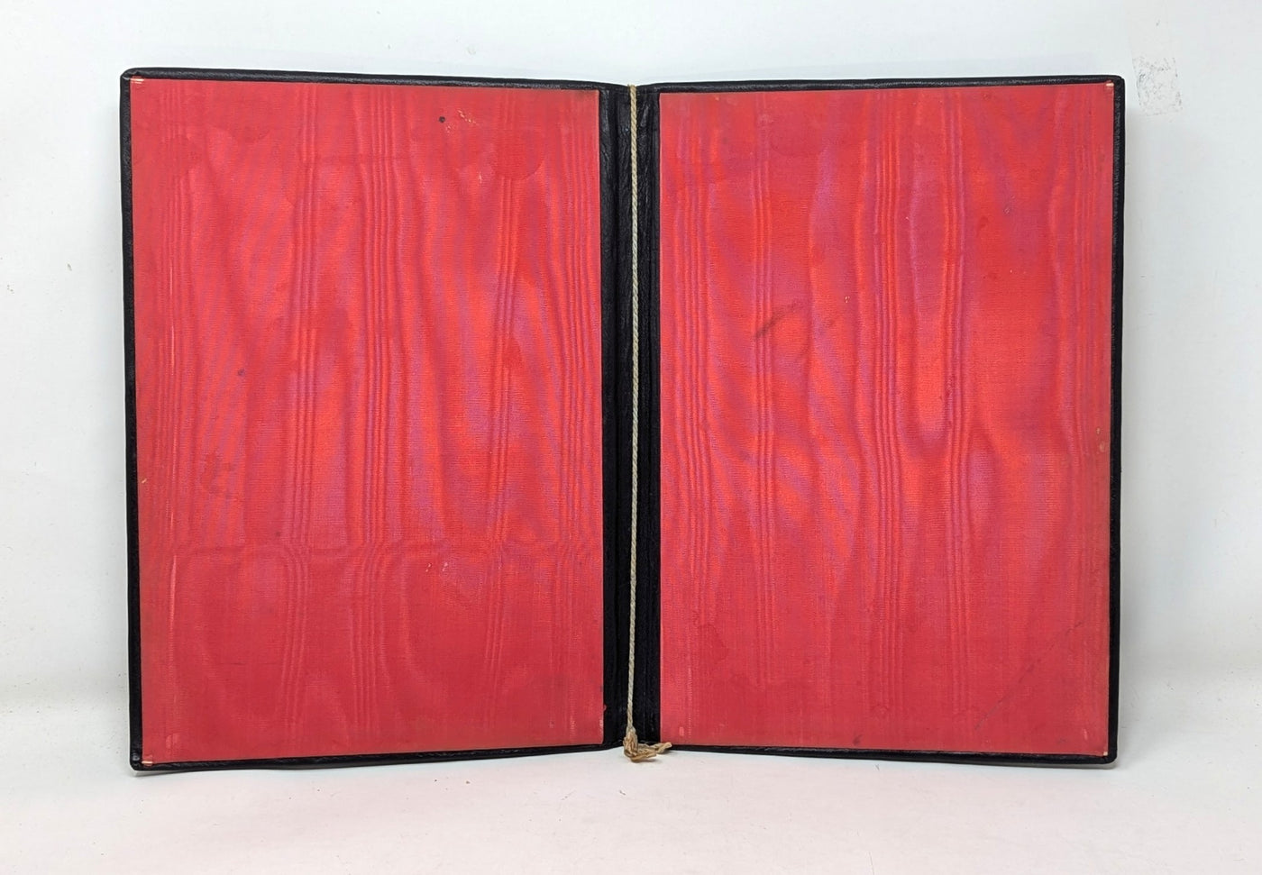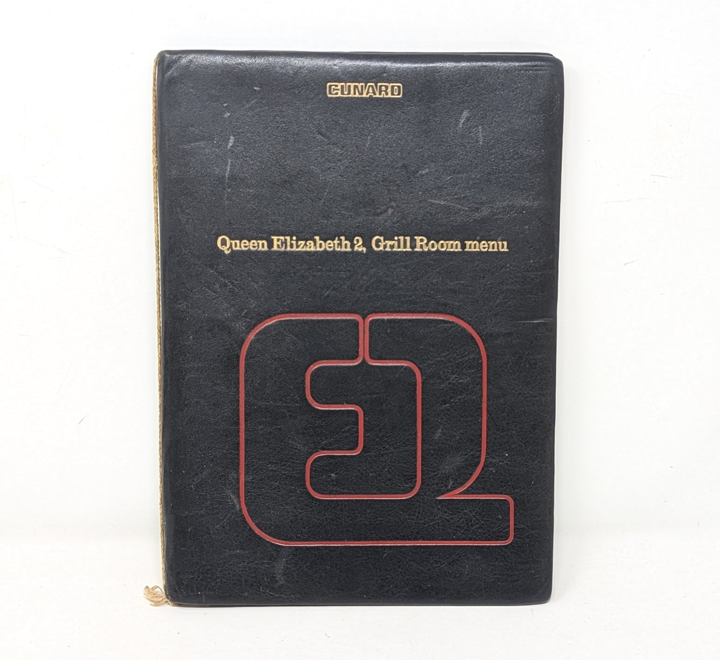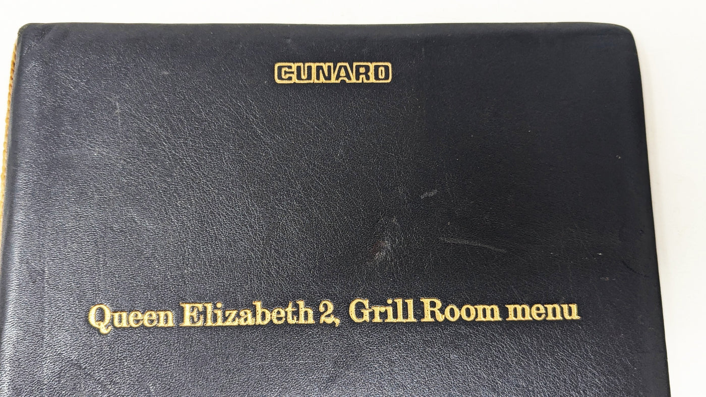 Cunard Line:  A luxurious padded menu cover in genuine English hide from the QE2's short-lived Grill Room.