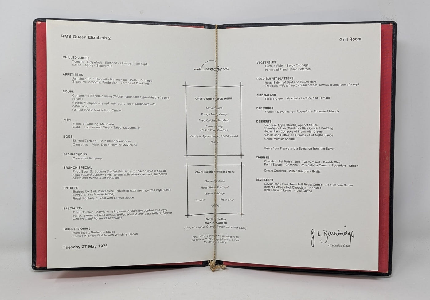 The cover measures 8.5" by 12"and features gold-stamped lettering along with the early QE2 logo stamped in red. The inside is lined in red silk. Stamped on back is "Genuine English Hide Cover, Made in England for Cunard by R.B. Booth of Birmingham."  A Grill Room menu is included for luncheon on May 27, 1975.